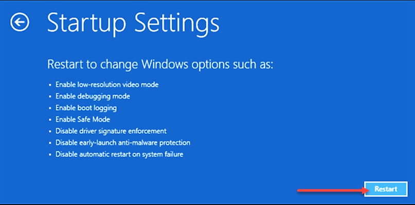 4. Upon clicking Advanced options you will be lead to a window and in there you need to click the Startup Settings feature and then you need to click Restart.
