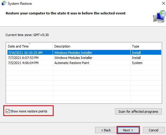 4. After clicking Next then you will be lead to another different window. Tick Show more restore points, which then will reveal the other restore points that have been automatically created by your PC. Choose the restore point which you want and then click Next.